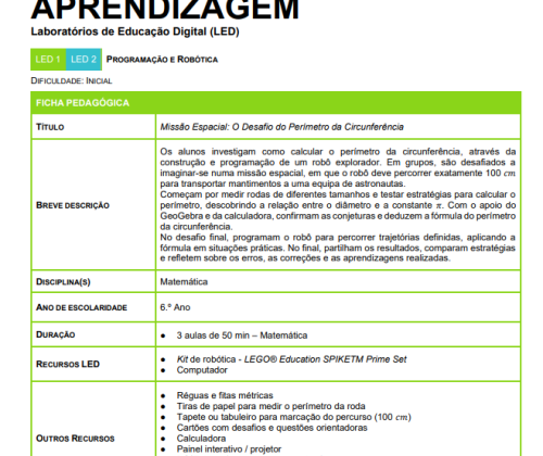 Os alunos investigam como calcular o perímetro da circunferência, através da construção e programação de um robô explorador. Em grupos, são desafiados a imaginar-se numa missão espacial, em que o robô deve percorrer exatamente 100 𝑐𝑚 para transportar mantimentos a uma equipa de astronautas. Começam por medir rodas de diferentes tamanhos e testar estratégias para calcular o perímetro, descobrindo a relação entre o diâmetro e a constante 𝜋. Com o apoio do GeoGebra e da calculadora, confirmam as conjeturas e deduzem a fórmula do perímetro da circunferência. No desafio final, programam o robô para percorrer trajetórias definidas, aplicando a fórmula em situações práticas. No final, partilham os resultados, comparam estratégias e refletem sobre os erros, as correções e as aprendizagens realizadas